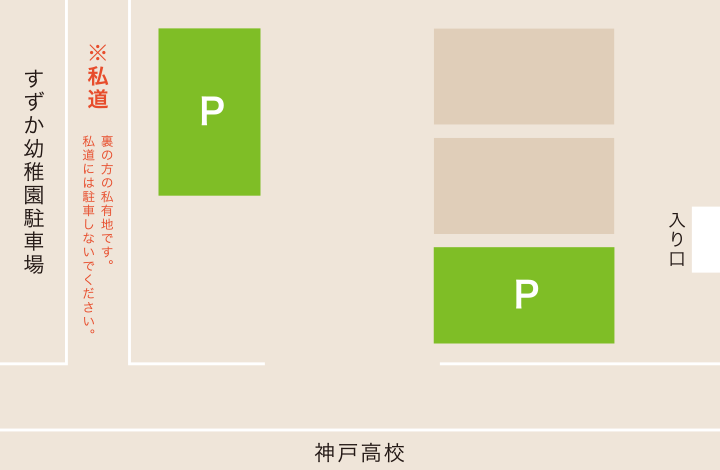 駐車場は建物の西側に二台停めることが出来ます。 駐車場の西側は私道とすずか幼稚園の駐車場がありますので、そこには絶対に駐車しないようご注意ください。